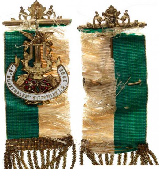 Vítkovice (Ostrava) - " D´ MÜRZTHALLEN" WITKOWITZ i. M. 1885 zlatá lyra v bílé smalt. stuze s nápisem, s barevnými květy na ze leno-bílé stuze, zakončené zlatými střapci 34,5x 83,5 mm