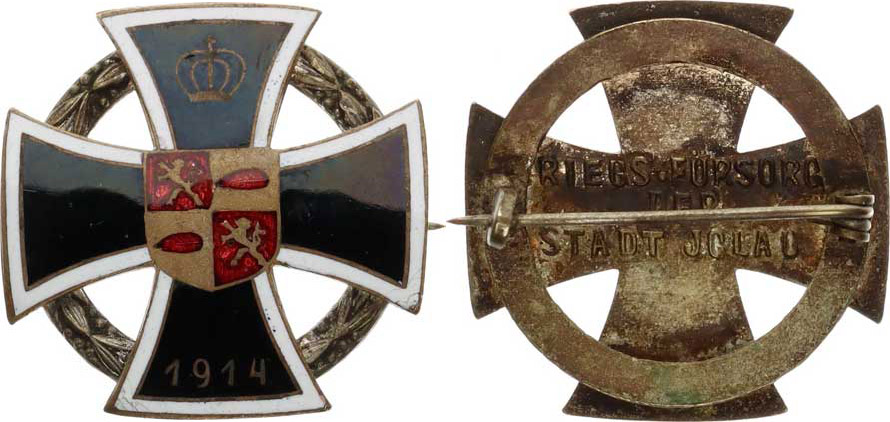 Odznak - "Kriegsfürsorge der Stadt Iglau 1914", na dubovém věnci černo-bílé smalt. tlapatý kříž, uprostřed v zlatém štítku městský nak, v horním poli kříže zlatá koruna, ve spodním datace 1914 30x30 mm zapínací sponka