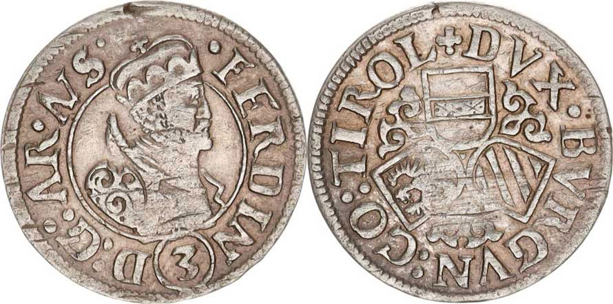 3 kr. b.l., Tyroly, Hall opis: .FERDIN()D:G:AR.AVS / DVX.BVRGVN:C O:TIROL 2,315g