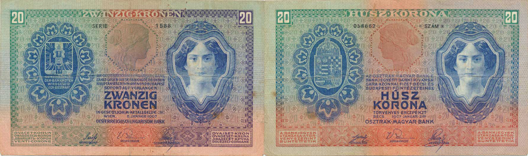 20 Kronen 2.1. 1907 sér. 1588 Pick 10, 2x přelož., jinak
