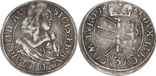Sigmund František - arcivévoda (1662-1665), 3 kr. 1663, Tyroly, Hall var.: ARCHID: AV:, tém.