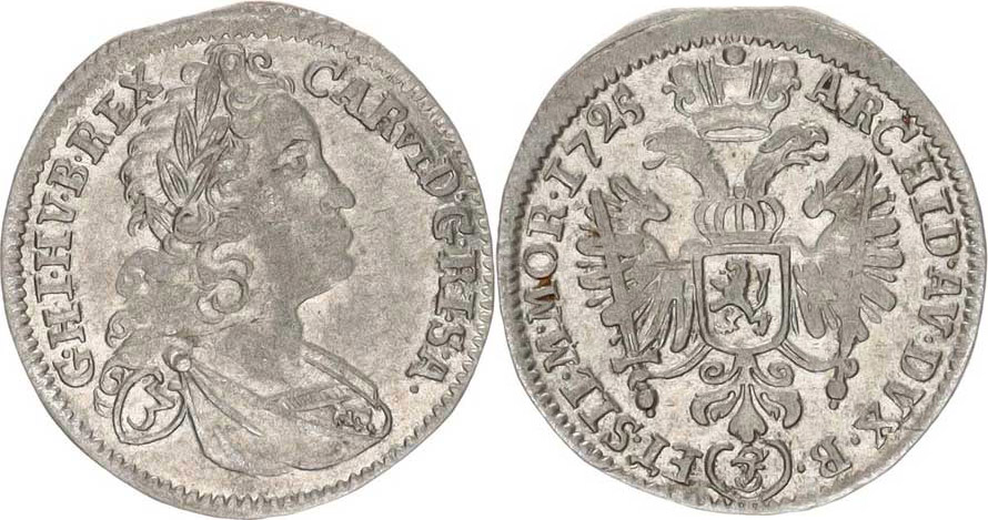 Karel VI. (1711-1740), 3 kr. 1725 FS, Praha Scharff jako MKČ 1838, opis: I. S. A. -