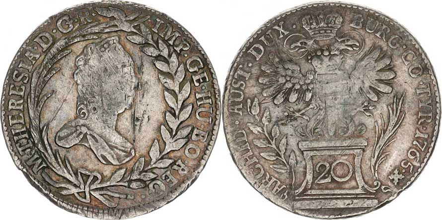 Marie Terezie (1740-1780), 20 kr. 1765 b.zn., Vídeň Nov.79, vryp