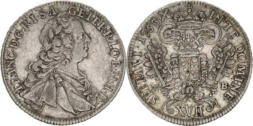 František Lotrinský (1745-1765), XVII kr. 1753 N-B, Nagybánya Husz. -, minc. zn. posunuta mezi