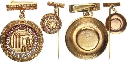 Odznak "Za výstavbu" Vítkovické stavby Ostrava 1960-1965 zlacený kov s červeným střed. kruhem na malém kov. štítku 30 mm +klopová miniatura 15 mm 2 ks v orig. etui