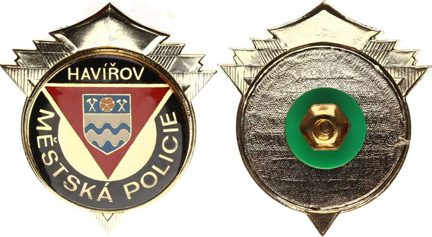 Čepicový odznak: Městská policie Havířov barevný elox. Al 57x64 mm upínací matice