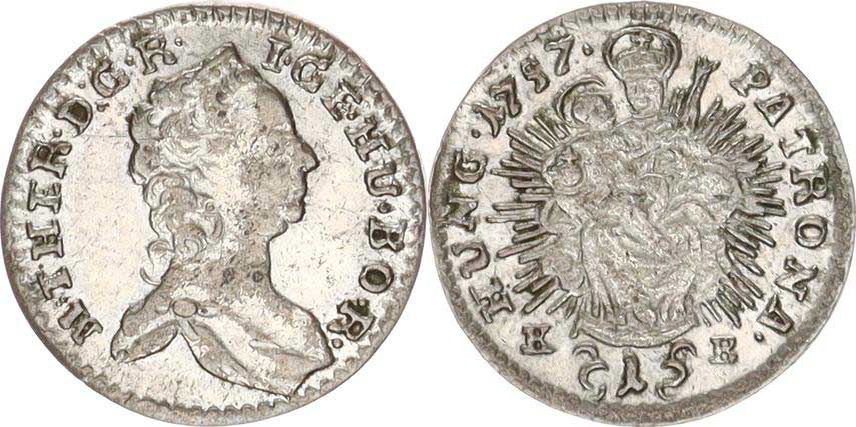 1 kr. 1757 K-B, Kremnica "R" Husz. 1745 0,787 g +podložní lístek