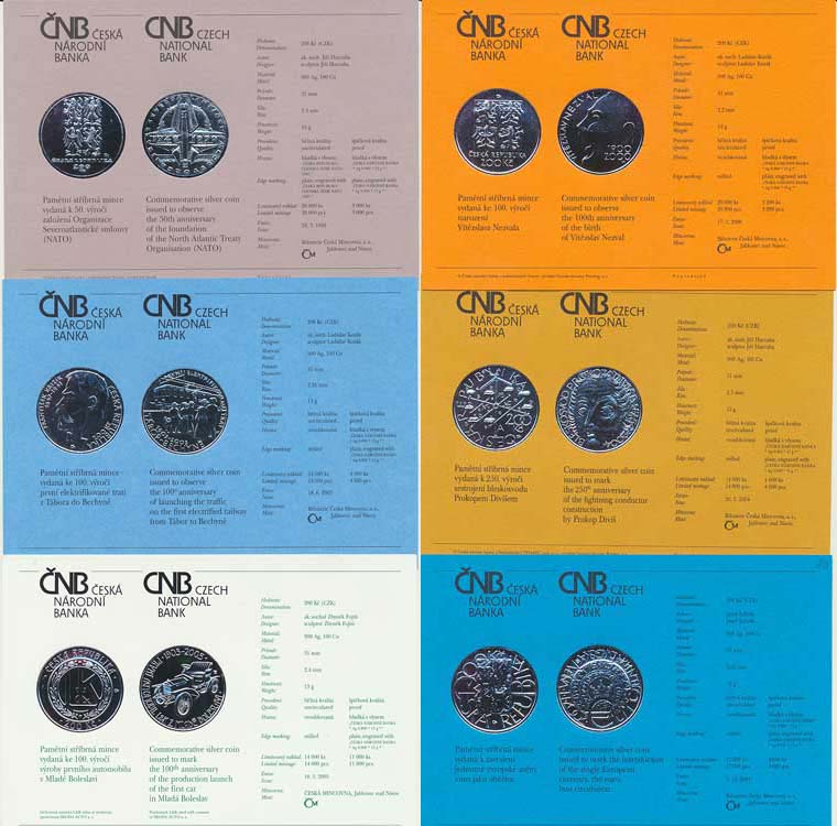 Certifikáty k českým pamětním mincím 1999 - 2005, 6 ks - NATO, Laurin Klement, Diviš, trať Tábor-Bechyně, Nezval, zavedení Euro