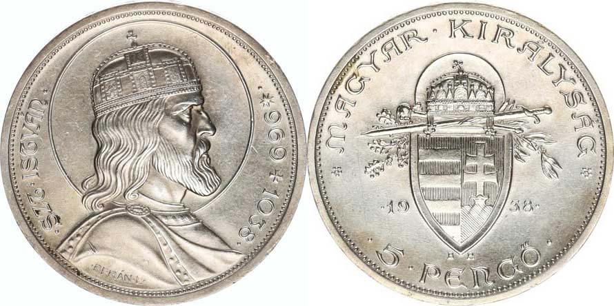 5 Pengö 1938 BP - sv. Štěpán KM 516_tém.