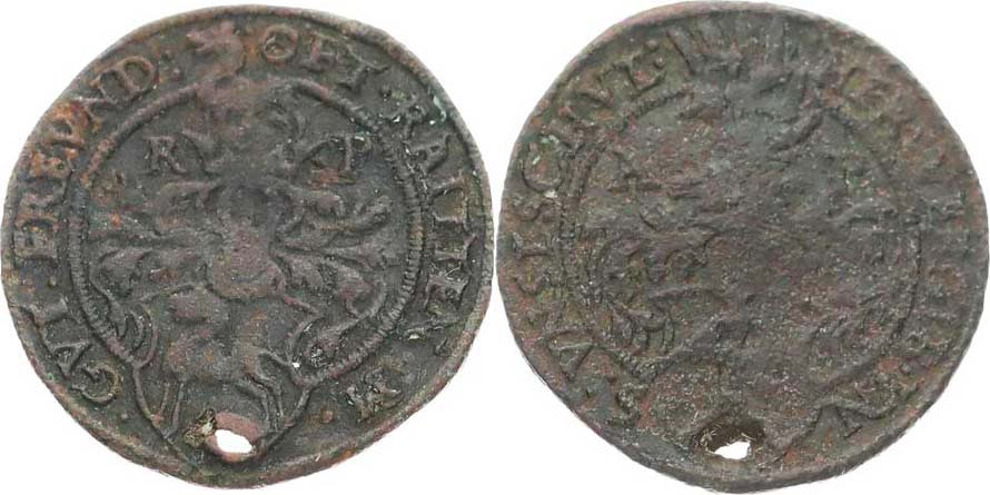 Početní groš b.l., Jáchymov-Ruprecht Puellacher (+ 1563) a Anna P uellacherin (+ 1575) Cu 24 mm 3,14 g Prokisch B.180/5 (nález Starý Kolín) +podložní lístek_dírka