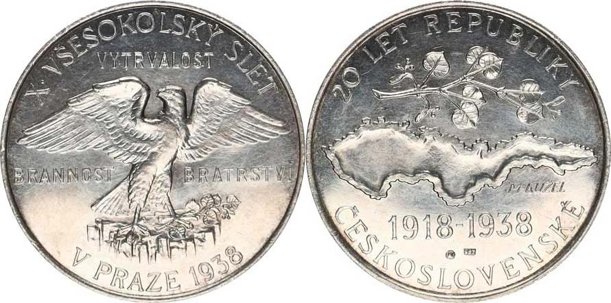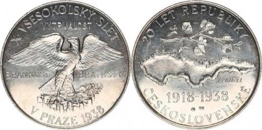 X. všesokolský slet 1938, sedící sokol / 20. výročí republiky, mapa republiky a lipová ratolest Ag 987/1000 35 mm 1 3,593 g "sbírkový"