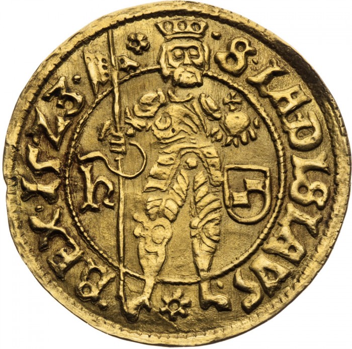 Ľudovít II. Jagelovský (1516 - 1526). Dukát 1523.