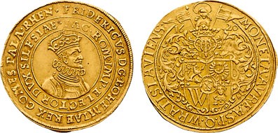 Položka 988. - Friedrich Falcký, 2 dukát 1620, mincovna Vratislav, Her.-, F.&S. 3469. Tato ražba je někdy řazena i mezi holdovací ražby či medaile. Vyvolávací cena zde byla stanovena na 20 000€ (cca 510 000,-Kč) a výsledná cena byla u této ražby 21 000€ (cca 535 000,-Kč + % provize).